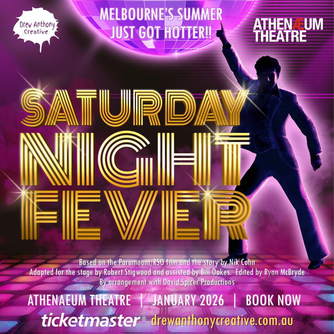 From January 8, 2026Athenaeum Theatre (Melbourne)TICKETS NOW ON SALEDrew Anthony Creative's award-winning production of SATURDAY NIGHT FEVER comes to Melbourne in January 2026. SATURDAY NIGHT FEVER is the ultimate celebration of the 1970s disco phenomenon that defined a generation and includes the Bee Gee’s hits ‘Stayin’ Alive’, ‘Night Fever’, ‘More Than A Woman’ and ‘How Deep Is Your Love’. Directed by Drew Anthony with choreography by Jamie & Suzi Rolton and Music Direction by Daniel Puckey, this reimagined new production of SATURDAY NIGHT FEVER propels the cult classic to dazzling new heights with explosive energy, sensational dancing and vocal performances that bring the amazing disco soundtrack to life. Based on the 1977 movie starring John Travolta, SATURDAY NIGHT FEVER is the story of Tony Manero and his quest to break free from conformity and become king of the club. The movie is credited with defining the 1970s, while the soundtrack remains the best-selling soundtrack of all time with over 45 million copies sold. BOOK NOWGROUP BOOKINGSReviewsReview: Roslyn Foo - GlamorazziReview: Wendy Samantha - The ScoopReview: Jonathan Cox - Stage WhispersReview: Alex First - The BlurbVideo: Saturday Night Fever Sizzle ReelVideo: Saturday Night Fever Opens2024 Production AwardsBroadwayWorld Awards Perth 2024Best Direction Of A Musical Best Scenic Design Of A Play Or Musical Best Supporting Performer In A Musical