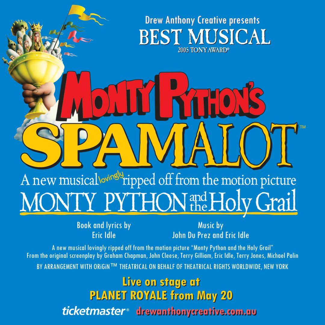 From May 20, 2026Planet RoyaleTickets on sale soonAUDITION INFODrew Anthony Creative brings one of Broadway's classic musicals to Perth in a hilarious all-new reimagined production. It’s just a flesh wound! MONTY PYTHON’S SPAMALOT, lovingly ripped off from the classic film comedy MONTY PYTHON AND THE HOLY GRAIL, retells the legend of King Arthur and his Knights of the Round Table, and features a bevy of beautiful show girls, not to mention cows, killer rabbits, and French people - Oh, and did I mention the bevy of beautiful showgirls? Bursting with unforgettable songs, absurd humour, and zany characters, this musical is a rollicking celebration of all things Monty Python. The Broadway production won three Tony Awards, including Best Musical. With its laugh-out-loud moments and unforgettable anthem “Always Look on the Bright Side of Life,” MONTY PYTHON’S SPAMALOT is a gloriously entertaining journey that leaves audiences in stitches from start to finish. AUDITION INFOThis production should not offend anyone (although you really can't tell these days) and is suitable for all ages. Subscribe at the bottom of this page to receive regular emails with Audition, Production, Ticketing, Workshops and other cool info. |